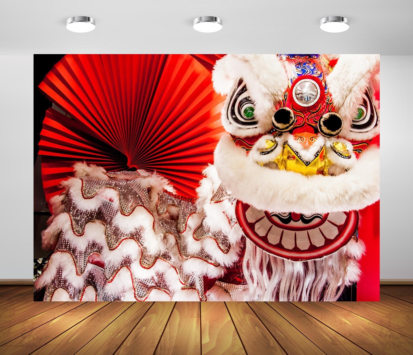 BELECO 10x6.5ft Fabric Chinese Lion Dance New Year Backdrop Chinese New Year with Red Fan Festival Background Spring Festival Lunar New Year Party Decorations Banner Photo Booth Studio Props
